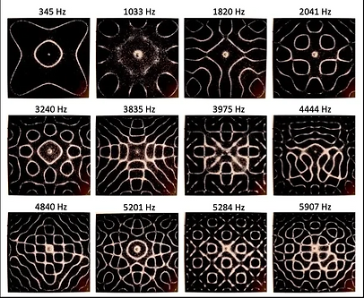 We observe that if a surface is sprinkled with fine sand, flour or dust and brought into a state of vibration through sound, a geometric pattern begins to form from the excited particles that changes according to the frequency of the sound (its note) and its volume. The pattern becomes increasingly complex and more intricate as the frequency gets higher.
