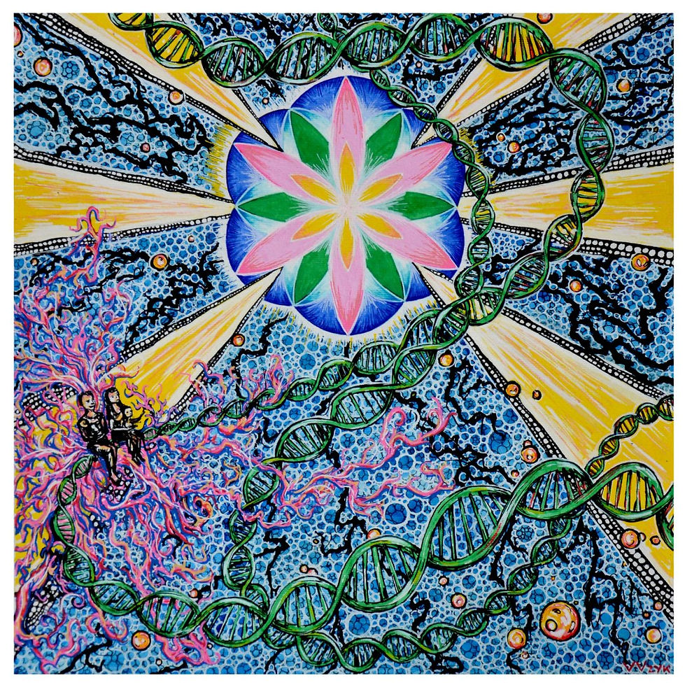 We are mainly made of water, thus the music we listen to creates those patterns onto our cells, our tears... Our DNA also looks like mandalas if we were cut slices into our DNA helipses